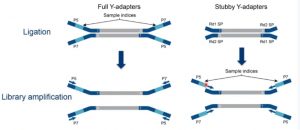 也可根據接頭是否匹配PCR free建庫的要求,將接頭分為長接頭(完整Y型接頭)和短接頭(非完整Y型接頭)。長接頭包括P5/P7+Index+Read1/Read2序列,可通過TA克隆連接到DNA片段后,形成完整的文庫結構,若文庫產量足量時,可不進行PCR擴增直接上機測序。短接頭只包含Read1/Read2序列,通過TA克隆連接到DNA片段后,需要通過PCR擴增將P5/P7和Index序列引入文庫結構中,形成完整的文庫結構后進行上機測序。