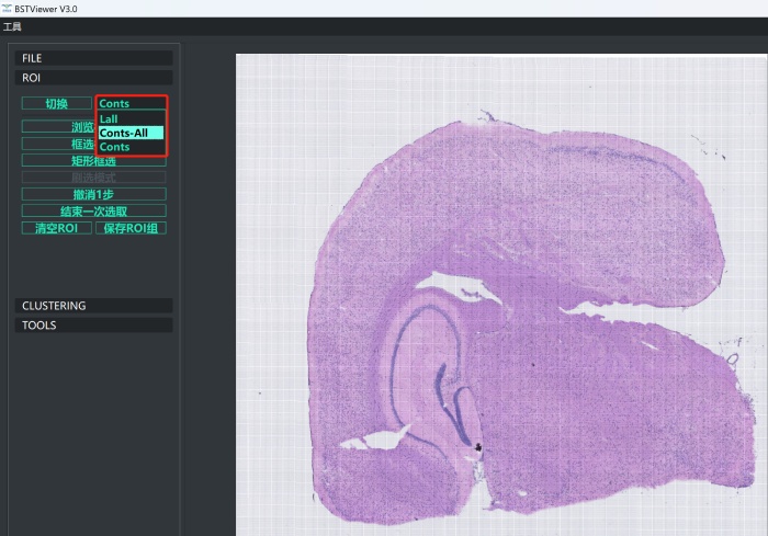 4)進行ROI 創建。點擊“ROI”按鈕,此處可以選擇全局聚類和部分區域聚類。cont和conts-all分別代表在全局下聚類與全局扣除空白區域聚類。區域聚類的話目前提供了“框選模式”和“矩形框選”兩種模式。框選合適的區域后點擊“結束一次選取”,選擇“保存或摳除”,完成之后點擊“保存ROI組”并命名即可;