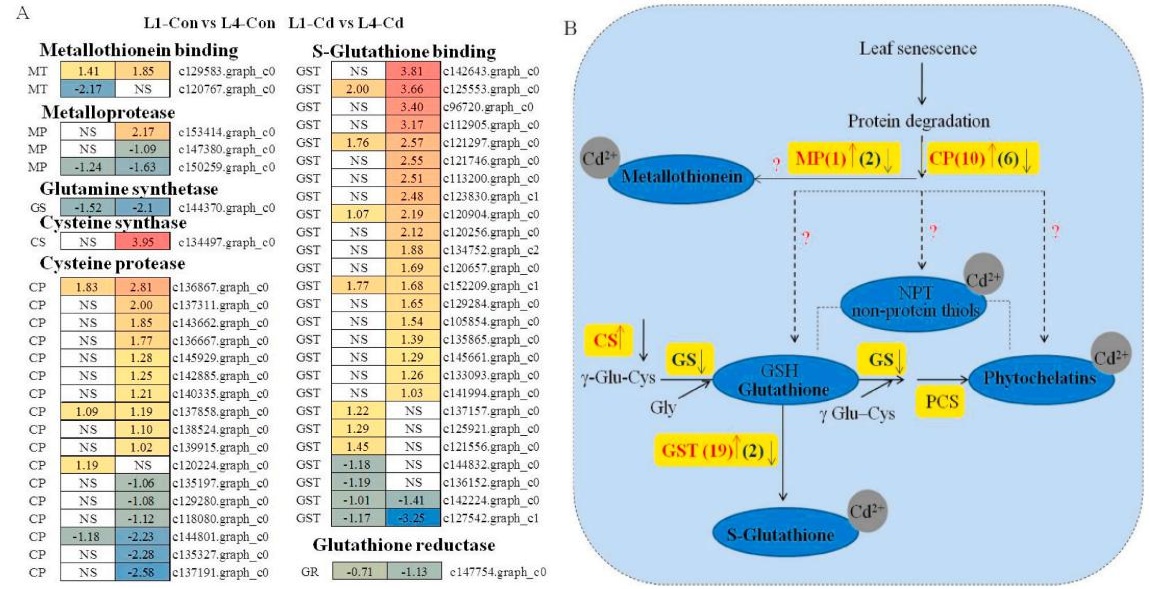 MT(金屬硫蛋白)是一組金屬結(jié)合蛋白,在金屬分配和穩(wěn)態(tài)中起著關(guān)鍵作用。1個(gè)上調(diào)基因(c129583.Graph_c0)和一個(gè)下調(diào)基因(c120767.graph_c0)編碼MT。Cd脅迫使上調(diào)基因的差異倍數(shù)比對(duì)照增加了23.8%,并完全抑制了表達(dá)下調(diào)的基因。結(jié)合Cd脅迫下MT含量的增加,作者的研究結(jié)果表明,MT-Cd結(jié)合可能在幼葉(L1)和衰老葉片(L4)的Cd解毒過程中發(fā)揮作用。半胱氨酸蛋白酶(CPs)是葉片衰老過程中負(fù)責(zé)蛋白水解活性的最豐富的酶。在該轉(zhuǎn)錄組中鑒定出17個(gè)編碼CP的基因。在對(duì)照組中,只有4個(gè)基因的表達(dá)有顯著差異。Cd脅迫顯著促進(jìn)CP表達(dá),有10個(gè)上調(diào)基因在Cd處理組的差異倍數(shù)高于處理組,Cd處理組的6個(gè)基因下調(diào)倍數(shù)低于對(duì)照組。然而,PC的蛋白水解活性是否與衰老葉片中Cd的積累有關(guān)尚不清楚。