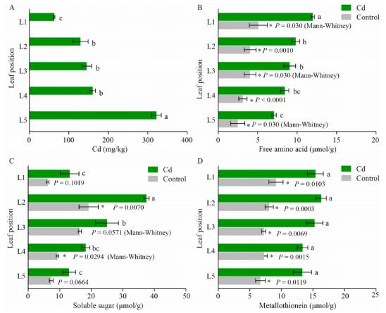 不同葉片Cd積累量顯著不同。葉片Cd濃度隨葉片數(shù)量的增加從上到下顯著增加,L2、L3、L4和L5的Cd濃度比幼葉(L1)增加了2.1、2.3、2.5和5.1倍。幼葉(L1)積累Cd最少,而衰老葉(L5)積累Cd最多。Cd處理顯著提高了各葉片游離氨基酸含量,但沒有改變其隨葉片衰老逐漸下降的趨勢,幼葉中游離氨基酸含量(L1)最高,然后隨著葉片衰老逐漸降低(圖1B)。衰老葉(L5)中游離氨基酸含量最低。成熟葉片中可溶性糖含量(L2)最高,Cd處理顯著提高了L2和L4的可溶性糖含量,然后隨著葉片衰老逐漸降低。衰老葉(L5)和幼葉(L1)的可溶性糖含量顯著低于綠色成熟葉。鎘脅迫下,與對(duì)照組相比,Cd處理顯著提高了所有葉片中的金屬硫蛋白含量,不同葉片金屬硫蛋白含量無顯著變化。