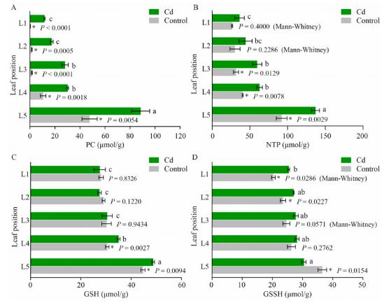 PC、GSH和NPT參與了超積累劑的Cd解毒機(jī)。Cd脅迫和對(duì)照組的植物螯合素(PCs)均隨葉片老化顯著增加。Cd處理顯著提高了各葉片PC含量,非蛋白硫醇(NPTs)含量也隨著葉片衰老而顯著增加,但隨葉片衰老的增加趨勢沒有變化。Cd處理顯著增加了衰老葉片(L4和L5)的谷胱甘肽(GSH)含量,但沒有提高幼苗和成熟苗的GSH含量。由此可以推斷,GSH、PC和NPT的增加及其與Cd的結(jié)合可能促進(jìn)了衰老葉片中Cd的積累。Cd處理顯著增加了幼葉和成熟葉的氧化谷胱甘肽(GSSH)含量(L1和L2),但降低了衰老葉(L5)的GSSH含量。由于氧化后的谷胱甘肽(GSSH)可被還原為還原型谷胱甘肽(GSH),還原性谷胱甘肽(GSH)可以通過GST進(jìn)一步催化GSH-Cd結(jié)合,GSSH向GSH的轉(zhuǎn)化與Cd在衰老葉片中的積累是一致的。