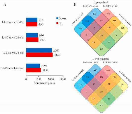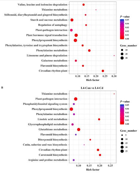 為了了解差異基因的功能,作者進(jìn)行了GO富集分析。四組的差異基因在節(jié)律過程、信號(hào)傳導(dǎo)和代謝過程等生物過程中都有20個(gè)豐富的分類。值得注意的是,與對(duì)照組相比,脫毒組的差異基因在幼葉和衰老葉中都有富集(L1-ConvsL1-Cd和L4-ConvsL4-Cd),但在幼葉和衰老葉的對(duì)照組和處理組中沒有明顯富集(L1-CdvsL4-Cd和L1-ConvsL4-Con)。
