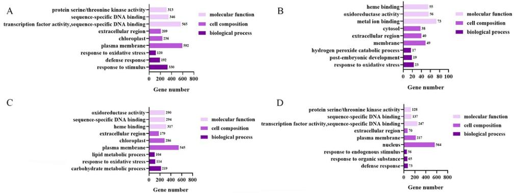 本研究對103份棉花材料在200mMCaCl2脅迫下萌發,從103份棉花材料中篩選出一個極端抗Ca2+基因型(中9807,R)和一個Ca2+敏感基因型(CRI50,S)。然后將這兩份材料分別在0mMCaCl2和200mMCaCl2中發芽5天,然后取樣進行轉錄組測序。形態學和生理學分析表明,在R中特異表達的PLR2可能通過促進SDG的合成來增強棉花清除活性氧的能力。綜上所述,本研究提出了棉花應對高鈣脅迫的適應機制,有助于提高棉花的抗逆性。