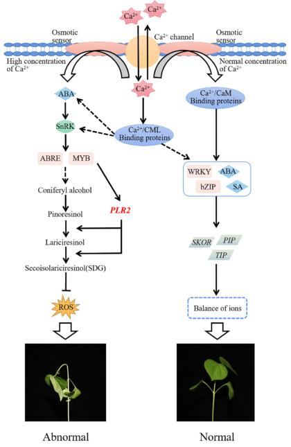 當Ca2+從細胞外或液泡涌入細胞質時,細胞質中的Ca2+濃度會增加,Ca2+會與一些Ca2+受體蛋白CaM和CML結合,形成Ca2+/CaM(CML)結合蛋白。激活的Ca2+信號導致一些下游轉錄因子的表達增加,如WRKY和bZIP,通過調節細胞內外水和離子的平衡,細胞在傳遞Ca2+信號后可以迅速恢復到低濃度Ca2+環境的狀態。同時,一些激素也受Ca2+信號的調節,如ABA和SA,可以緩解棉花中的Ca2+瞬變。當植物暴露于高濃度的Ca2+時,它們再也不能抵抗單獨由通道蛋白引起的大量Ca2+造成的損害。R將通過ROS清除機制與通道蛋白形成復雜的調節網絡,共同緩解高Ca2+應激。滲透受體感應到Ca2+的增加,然后調節ABA的合成,激活ABA信號通路。首先,增加的ABA與PYL蛋白結合并與PP2C相互作用,通過SnRK促進一些下游因子的磷酸化,并啟動ABA信號反應。此時,編碼PLR2的轉錄因子ABRE和MYB被激活。然后,通過促進松脂醇合成落葉松烯醇,落葉松烯醇合成SDG,從而提高活性氧的清除能力,從而增強棉花抵御高Ca2+脅迫的能力(圖4)。