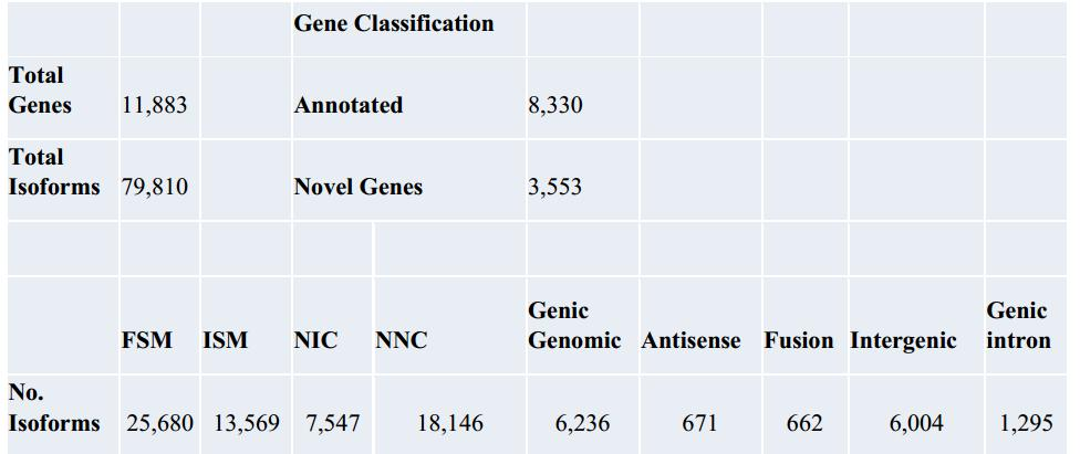 作者獲得了3100萬次reads,其中使用Canu對2200萬reads(71%)進行了錯誤糾正,只關注全長reads,通過確定為具有5’引物和poly(A)和3’引物的序列全長序列。ToFU轉錄組結果包含總共11,883個基因和79,810個亞型(表北京百邁客生物科技有限公司1),其中8330個基因與NCBI注釋基因匹配,而3553個基因是新的。所有這些都對應于橄欖蠅轉錄組在同種型水平上比當前NCBI注釋的四倍擴增。針對UniprotSwiss-prot數據庫的預測蛋白質序列的搜索顯示高比對的是雙翅目,其次是哺乳類動物(圖1B)。盡管鑒定了3553個新基因,但預計只有269個含有開放閱讀框。與注釋基因相比,超過50%的新基因是單外顯子,其中超過80%的基因是多外顯子并且還包含更高百分比的單同種型基因。且新基因的表達量要低于已注釋基因。在結構上,SQANTI根據其剪接點和基因組坐標將轉錄本分為9類,分別為FSM,ISM,NIC,NNC,基因組基因,反義,融合,基因間區和基因內含子(圖1E)。