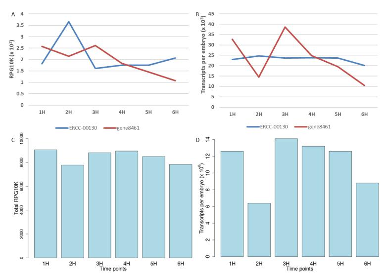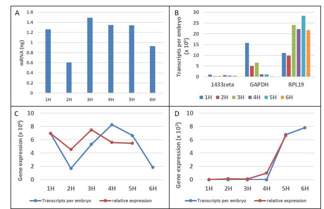 通過將每個胚胎的每個基因的所有轉錄物相加并計算以毫微克計的當量來計算每個胚胎的總mRNA(圖3A),總mRNA在1hpo時從1.2ng/胚胎下降至2hpo時為0.61ng/胚胎,然后在3hpo時增加至1.49ng/胚胎,然后在6hpo采樣結束時降至0.93ng/胚胎,反映了每個胚胎的總轉錄本(圖2D)。假設2-5%的總RNA是多腺苷酸化的,mRNA水平與我們在每個胚胎中獲得的總RNA產量一致。