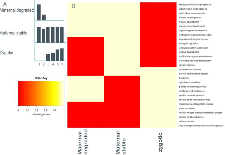 我們對3個類別基因集進行富集分析;母體降解基因,受精卵基因和母體穩定/上調基因。母體降解基因也是1hpo中表達高的基因,富含細胞過程,發育和新陳代謝(圖6)。母體降解的基因也富含轉錄因子,例如DREF,BEAF-32A,PNR,它們是相應的果蠅同源基因。類似母體降解基因,母體穩定/上調基因在翻譯,生物合成過程,基因表達,代謝過程等方面得到豐富,反映了快速生長胚胎的高代謝活性,DREF轉錄因子也在這些基因中富集。受精卵基因富含特定的組織形成和發展過程,包括:后腸發育,模式規范,消化道形態發生等功能。