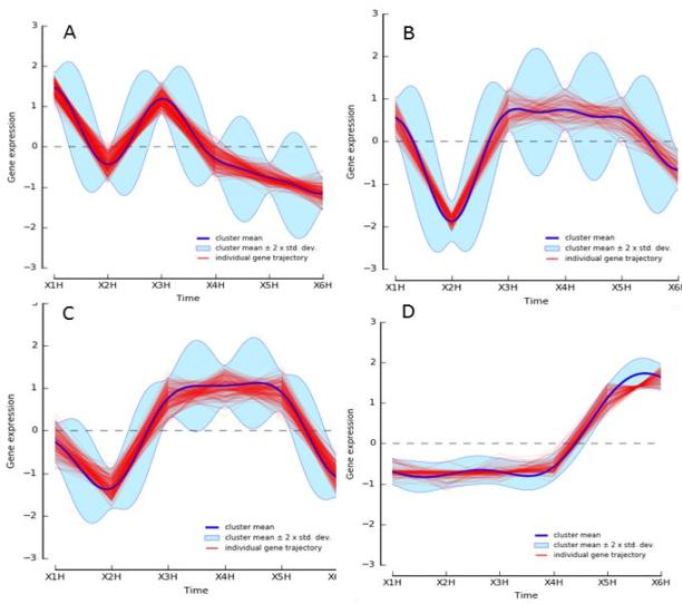 基因表達是一個嚴格調控的過程,在胚胎發育過程中,基因表達的時空動態調控對器官的正常發育至關重要?;谄鋾r間表達動力學的基因聚類不僅將表達基質的復雜性降低為簡單的基因集,而且還可以鑒定具有與先前所示相似的生物學功能的基因。實際上,我們鑒定了在不同時間點表達達到峰值的基因,證明了高度動態的轉錄本動力學,并表明這些基因在確定的發育期間具有特定的作用(圖7)。我們進一步將這些集群分為3組;1)基因在3hpo達到峰值并且通常隨時間降低,稱為早期基因(圖7A),2)基因,其表達維持3-5hpo,稱為中間基因(圖7B和C),和3)基因其表達僅在5和/或6hpo時增加,稱為晚期基因(圖7D)。富集顯示,如先前在母體類別的基因中所觀察到的,早期基因和中間基因在細胞過程和代謝過程中富集,而晚期基因在專門的發育過程中富集。