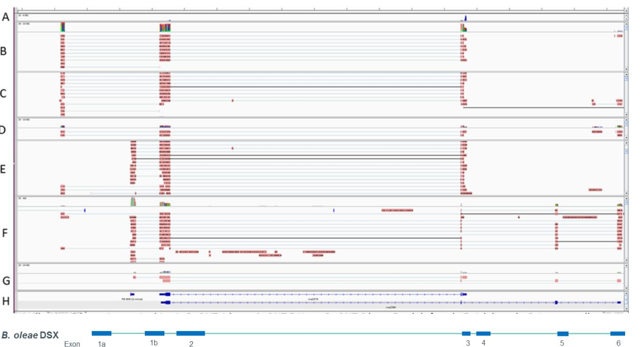 雙翅目昆蟲的性別決定機制在很大程度上是相同的,在果蠅(Drosophilamelanogaster)中,性別決定機制已被廣泛研究,性致死基因(sxl)作為主要調節因子,根據性染色體與常染色體的比例,調節本身和變異基因(tra)的性別特異性選擇性剪接。tra反過來調節性別特異性雙重性別的選擇性剪接(dsx),這是級聯的最后一個成員和性別差異發育的中介。B.oleae同源物已經鑒定了sx1,tra和dsx。然而,主要的調控方式仍然難以捉摸。已經提出橄欖蠅的性別決定在胚胎發育的前6小時內發生,并且通過類似于黑腹果蠅中的性別決定機制的tra和dsx的可變剪接來調控。在轉錄組數據中,我們能夠觀察到tra和dsx的各種可變剪接。使用來自成年雄性和雌性頭部的數據來識別性別特異性亞型。在dsx的情況下,與成齡相比,早期發育階段的亞型復雜性顯著不同。在數據中,看到具有不同轉錄起始位點和長度較長的亞型,因為在發育的早期胚胎階段存在突出的亞型(圖8),成齡頭部組織中的這些亞型轉移到較短的亞型中,外顯子4存在于雌性中但不存在于雄性中。由于我們無法在早期胚胎階段檢測到這些性別特異性亞型,我們認為它們的表達在發育過程后期開始。然而,它們在后期階段的積累代表了在發育早期階段激活的性別調控系統。北京百邁客生物科技有限公司。