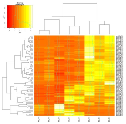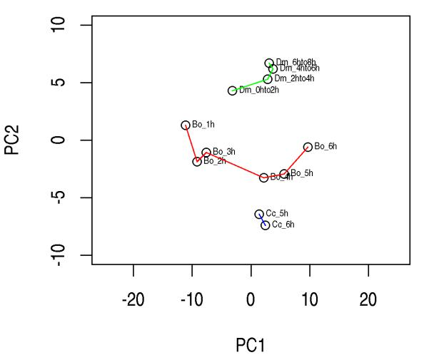 進一步尋求確定觀察到的表達模式是否可以在不同的生物樣品組中重復并使用實時定量PCR(qPCR),這是當前用于量化基因表達的標準方法。然而,qPCR基因表達的相對方法需要鑒定內參基因其表達在樣品間保持穩定。使用作者的數據來確定這些常見內參基因以及GAPDH的表達水平的變化,評估了3個基因的qPCR表達;SRY,HID和LINGERER,用RPL19和14-3-3zeta作為內參基因,在不同的生物重復樣品組中(跳過6小時時間點)。我們觀察到類似的基因表達趨勢(特別是14-3-3zeta與RPL19相比)。為了進一步探索表達譜,我使用差異表達的明顯的基因進行主成分分析(PCA)和層次聚類分析,第一個主成分將前3個時間點與最后3個時間點分開,分層聚類進一步表明前3個和后3個時間點是分別共同聚類的。