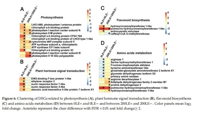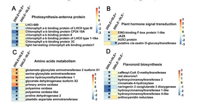 E.gansuensis顯著激活10個基因和5個光合作用基因分別為0mM和200mMNaCl濃度下。E.gansuensis的作用寄主植物的光合作用基因更明顯在0mMNaCl下比200mM氯化鈉(圖6A)。此外,E.gansuensis顯著激活植物的五個信號傳導基因在0mMNaCl濃度下;這些基因包括乙烯信號通路的兩個基因、生長素信號通路的兩個基因和脫落酸信號通路的一種基因。然而,E.gansuensis沒有顯著激活植物激素信號轉導基因在200mMNaCl濃度13下(圖6B),這意味著NaCl的影響大于E.gansuensis在植物激素基因表達方面的研究。E.gansuensis顯著下激活植物激素信號轉導基因在0mMNaCl濃度下,但E.gansuensis在200mMNaCl濃度下顯著調控兩個類黃酮生物合成基因(圖6C)。E.gansuensis顯著抑制氨基的八個基因在0mMNaCl濃度和E.gansuensis的酸代謝顯著激活下激活植物激素信號轉導基因在200mMNaCl濃度下的(圖6D)。更遠,E.gansuensis顯著下調甘氨酸、絲氨酸和蘇氨酸代謝,以及作為色氨酸代謝在0mMNaCl濃度下。E.gansuensis顯著下調賴氨酸降解,上調精氨酸和脯氨酸代謝在200mMNaCl下。因此,很可能,E.gansuensis通過調節宿主氨基酸代謝來提高A.inebrians的耐鹽性。