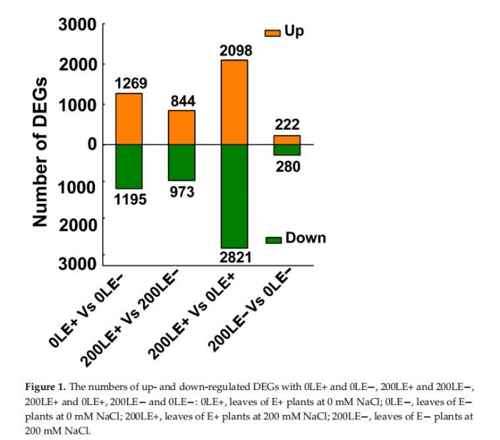 進一步闡明E.gansuensis在NaCl脅迫下對寄主植物生長的分子機制,E+和E-A.inebrians葉片(28天齡)的轉錄組通過Illumina測序進行分析。E+A.inebrians和E-A.inebrians用含0mMNaCl和200mMNaCl濃度處理。閾值FDR≤0.01和FC≥2用于確定DEG(差異表達基因)。結果顯示響應E.gansuensis的轉錄本發生顯著變化,在0mMNaCl和200mMNaCl濃度下的分別發生2464和1817DEGs(圖1)。此外,在NaCl脅迫下,轉錄本發生了顯著變化,E+葉子的4919個DEG。然而,一個小的轉錄組變化發生在對NaCl脅迫的響應,E-葉為502DEG(圖1)。