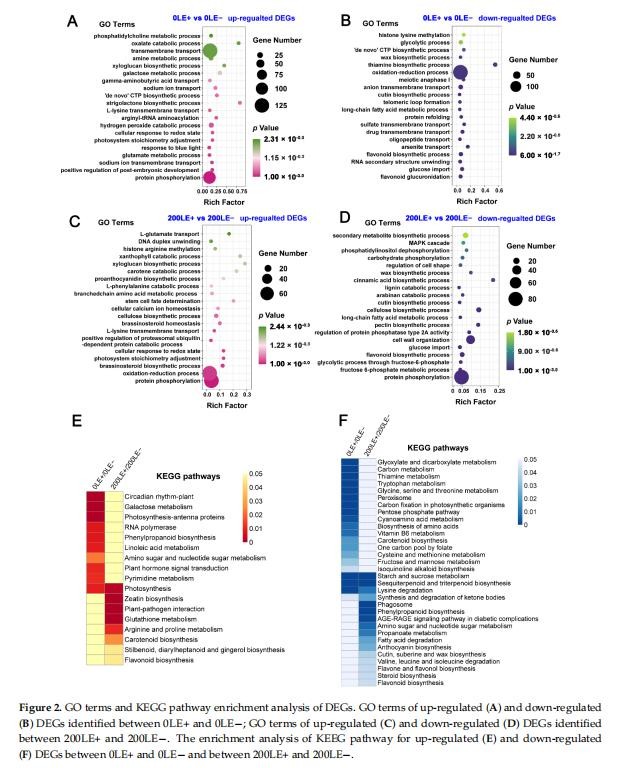 E.gansuensis上調1269個基因,下調1195個0LE+基因(葉E+植物在0mMNaCl下)與0LE-(E-植物在0mMNaCl下的葉子)相比。類似地,E.gansuensis誘導844個基因并抑制200LE+(E+植物的葉子)的973個基因在200mMNaCl下)與200LE-(E-植物的葉子在200mMNaCl下)相比(圖1)。目前的結果表明在NaCl脅迫下E.gansuensis對基因的調控有巨大的影響與200mMNaCl相比。對0LE+和0LE-之間的DEGs進行GO富集分析發現,E.gansuensis主要誘導“鈉離子跨膜轉運”、“胚胎后發育的正調控”、“蛋白質磷酸化”、“光系統化學計量調整”和“谷氨酸代謝過程”(圖2A)。此外,GO富集分析表明,類別“類黃酮葡萄糖醛酸化”、“類黃酮生物合成過程”、“氧化-還原”過程”和“陰離子跨膜轉運”在下調中富集E.gansuensis在0mMNaCl濃度下的DEGs(圖2B)。這些結果暗示E.gansuensis重新編排了植物生理學和重要生物學的許多方面提高寄主植物的競爭力。GO富集分析在200LE+和200LE?之間的DEGs表明,E.gansuensis主要誘導“蛋白質磷酸化”、“氧化還原過程”、“油菜素類固醇生物合成過程”、“細胞鈣離子穩態”和“L-谷氨酸轉運”(圖2C);此外,GO富集分析發現“蛋白質磷酸化”的類別,“果糖6-磷酸代謝過程”、“類黃酮生物合成過程”和“MAPK”在200mMNaCl濃度下,E.gansuensis在下調的DEG中富集級聯”(圖2D)。我們的研究結果表明,E.gansuensis通過激活細胞信號轉導促進宿主在脅迫環境下的生長,維持平衡。促進ROS、Ca2+信號和油菜素類固醇(BR)的生物合成,它們在抗壓過程中起作用。