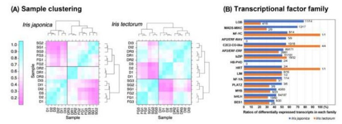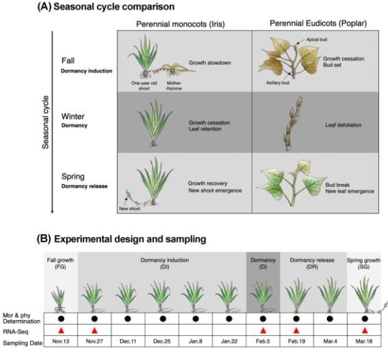 冬季休眠是植物應(yīng)對(duì)潛在致命環(huán)境的最關(guān)鍵策略。近幾十年來(lái),由于氣候的變化,在經(jīng)濟(jì)上具有重要意義的多年生雙子葉植物中的這一過(guò)程得到了廣泛的研究。然而,在不需要冷卻的常綠單子葉植物中,休眠過(guò)程至今仍是一個(gè)謎。因此,揭示這些單子葉植物越冬休眠的調(diào)控機(jī)制,不僅有助于更好地開(kāi)發(fā)利用植物資源,而且對(duì)應(yīng)對(duì)全球變暖帶來(lái)的低溫不足的挑戰(zhàn)具有重要意義。通過(guò)多年物候觀測(cè)發(fā)現(xiàn),鳶尾和蝴蝶花越冬休眠過(guò)程均僅有生態(tài)休眠,將休眠植株移至適宜條件下能迅速恢復(fù)生長(zhǎng),且在同一栽培地區(qū)二者越冬休眠期存在明顯差異,是研究多年生單子葉植物越冬休眠機(jī)理的理想材料。本研究比較了鳶尾(I.tectorum)和蝴蝶花(I.japonica)在關(guān)鍵發(fā)育時(shí)間點(diǎn)的休眠過(guò)程。這兩種鳶尾都表現(xiàn)出短暫的休眠過(guò)程,且持續(xù)時(shí)間不同,在溫暖條件下都能很容易地恢復(fù)生長(zhǎng)。為了破譯轉(zhuǎn)錄變化,作者對(duì)鳶尾進(jìn)行了全長(zhǎng)測(cè)序,對(duì)蝴蝶花進(jìn)行了RNA-seq測(cè)序,分別生成參考轉(zhuǎn)錄組,揭示了調(diào)控常綠與落葉類鳶尾越冬休眠的分子機(jī)制。