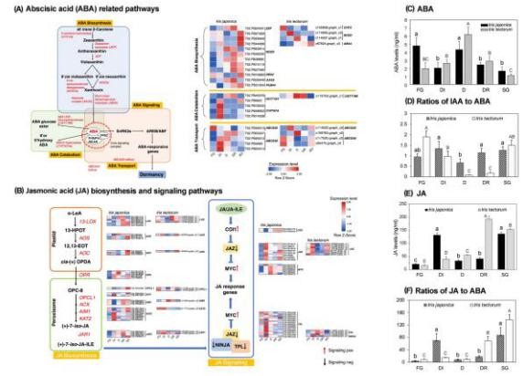 為了進(jìn)一步解剖鳶尾越冬休眠所必需的基因和通路,我們對(duì)基因表達(dá)譜和相關(guān)生理特征進(jìn)行了更詳細(xì)的研究。結(jié)果表明,脫落酸水平在D期升高了兩倍以上,并與SER呈顯著負(fù)相關(guān),表明脫落酸在鳶尾越冬休眠中的保守作用。脫落酸生物合成和分解代謝的穩(wěn)態(tài)jing q調(diào)控植物中的脫落酸水平。相比之下,IJ中參與脫落酸生物合成的差異轉(zhuǎn)錄本在DI過(guò)程中保持較低的表達(dá)水平。因此,作者推斷IJ中脫落酸水平的降低比IT中保證了更長(zhǎng)的營(yíng)養(yǎng)生長(zhǎng)周期。推測(cè)這可能是由于脫落酸生物合成的抑制和分解代謝的活躍所致。