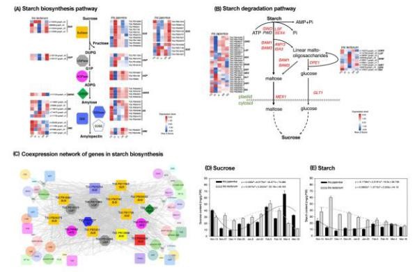 五、差異轉(zhuǎn)錄本在碳水化合物代謝和蔗糖和淀粉含量中的表達(dá)