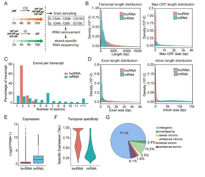 lncRNA被證實是生物過程的關鍵調控因子,調節包括mRNA轉錄、穩定性、翻譯和翻譯后修飾等多種生物途徑。之前研究表明昆蟲lncRNA參與了例如殺蟲劑抗性、繁殖力和腺體凋亡等生物過程,但是尚未有證據證明lncRNA可以調節非模型昆蟲的行為。蝗蟲是世界范圍內的一種農業害蟲,表現出顯著的表型可塑性。為了鑒定與其型變相關的lncRNA,本文系統地分析了蝗蟲lncRNA的表達并注釋其功能,證實與mRNAs相比lncRNAs顯示對型變更敏感的響應,并證實了其中一個lncRNA可調節型變相關行為。本研究揭示了lncRNA在蝗蟲型變中的重要作用以及表型中蛋白編碼基因和lncRNA之間的相互作用。深入解析蝗蟲散居型和群居型轉變的分子機制,為可持續治理蝗蟲的新策略和新方法的開發提供了基礎。