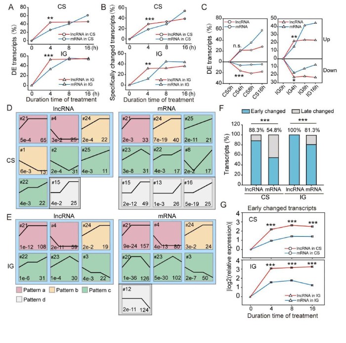 為了進一步分析lncRNA和mRNA的表達模式,使用了短時間序列表達挖掘器(ShortTime-seriesExpressionMiner,STEM)對基于表達的轉錄本進行聚類。在CS期間,將214個lncRNA和242個mRNA分別分為8個和9個重要的表達譜(圖3D)。其中lncRNA表達譜15以及mRNA表達譜15、13和16直到群居化處理后8或16小時才改變。這些配置文件稱為后期更改的配置文件(模式d)。與后期更改的配置文件相反,早期更改的配置文件以4小時時間點開始的轉錄表達變化為特征。根據4小時后的表達變化,將早期變化的輪廓細分為模式a(早期變化)、模式b(早期中變化)和模式c(可持續變化)。在IG過程中,269個lncRNA和639個mRNA分別聚集成6個和7個顯著表達譜。所有lncRNA配置文件均為早期變化(圖3E)。在mRNA表達譜中,有6個是早期改變的,而譜12是晚期改變的。在CS和IG期間,lncRNA的聚類分布圖的數量與mRNA的分布無明顯差異。但是,通過計算譜圖中的轉錄本數量,發現早期改變的lncRNA的百分比比CS中的mRNA的百分比高61.1%(88.3%vs.54.8%,圖3F)。同樣,IG中早期改變的lncRNA的百分比高于IG中的mRNA(100%vs.81.3%,圖3F)。因此,lncRNA比mRNA對散居化和群居化處理的反應更快。在CS中,早期改變的lncRNA的表達變化速率快于285個mRNA的表達變化速率(0.55vs.0.24)和IG(0.77vs.0.39)(圖3G)。因此,早期改變的lncRNA的比例和表達變化率高于早期改變的mRNA。因此,蝗蟲lncRNA比mRNA對種群密度的變化更敏感。