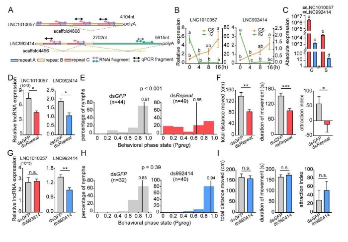 為為了驗證LNC1010057和LNC992414在蝗蟲型變中的功能,進行了一系列分子生物學實驗。首先,克隆了在LNC1010057和LNC992414基因座中鑒定出的長的轉錄本。LNC1010057由重復的A、B和C元素組成,這些元素依次分布并重復4次,但C元素重復三次(圖5A)。序列比對證明LNC992414在5’端與LNC1010057共享相似的重復序列,但是它們是從不同的基因組基因座轉錄而來的(圖5A)。盡管LNC992414的定量表達水平可以通過特異性引物檢測,但LNC1010057的表達水平為重復元件的總表達水平。如預期的那樣,LNC1010057和LNC992414的表達模式極為相似。在CS期間,兩種lncRNA的表達持續增加,并且在16h幾乎增加了四倍(圖5B)。在IG期間,4h后表達水平顯著下降,之后保持相對穩定(圖5B)。LNC1010057和LNC992414之間的序列結構和表達模式的相似性表明它們是同源的lncRNA。但是,實時qPCR分析表明,在散居型和群居型蝗蟲的大腦中,LNC1010057的表達水平比LNC992414的表達水平高約1000倍(圖5C)。其次,為了測試LNC1010057和LNC992414是否參與蝗蟲型變調節,在通過RNAi抑制蝗蟲大腦中的表達后進行了行為分析。顯著降低LNC1010057的表達水平(7470對3764610)和LNC992414(1.9vs.1.0)(圖5D)后行為分析表明,群居型蝗蟲其行為顯著改變為散居狀態(圖5E)。此外,多個與型有關的行為參數發生了變化。總移動距離(TDM)和總移動持續時間(TDMV)顯著降低(圖5F),但是,移動速度沒有區別。同時群居蝗蟲的特定喜好行為顯著下降(58.3對-13.5圖5F)。但LNC992414表達降低并未引起從群居狀態到散居狀態的轉變(圖5G和H)。與對照相比,與型相關的行為參數(包括運動和特定物種的優選行為)沒有差異(圖5I)。LNC992414的RNAi實驗不會引起行為變化,因此排除了LNC992414調節蝗蟲型變的可能性。這些結果表明是LNC1010057而不是LNC992414潛在地調節了蝗蟲的型變。