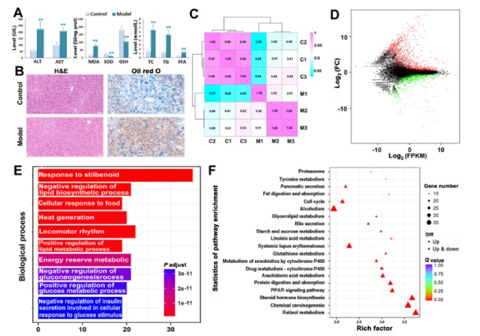 誘導小鼠發生NAFLD,結果顯示血清ALT、AST、TC、TG、FFA水平顯著升高;MDA、SOD和GSH水平的變化表明模型組小鼠肝臟的氧化應激狀態(圖1A)。通過H&E染色和油紅O染色觀察模型組肝組織病理改變和脂質堆積情況(圖1B)。