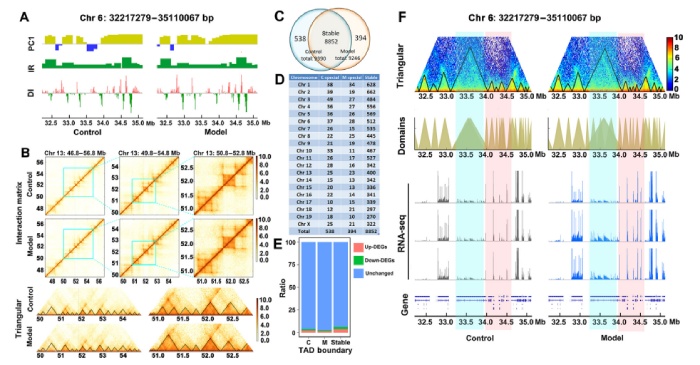 作者用TadLib軟件在20kb分辨率下識別TADs。在對照組和模型組TAD比較中,作者在對照組中發現了8179個TAD,在NAFLD組中發現了7818個TAD,其TAD大小中位數為180 kb。TAD結構分析表明,TADs具有穩定的染色質結構特征。方向性指數(DI)衡量了給定感興趣區域接觸方向的不平衡46,并與TAD邊界有關,TAD邊界顯示出從上游到下游DI的強烈轉移特征(圖4A)。作者在對照組和NAFLD中分別識別出9390和9246個TAD邊界,其中538個為特殊控制邊界,394個為模型組邊界)。TADs在對照組和NAFLD組之間高度相關,只有大約5%的TAD邊界在NAFLD發展過程中發生改變。TADs在基因表達調控中發揮重要作用,繪制了與差異TAD邊界相關的DEGs,并分析了它們的數量。圖4E所示為各組唯一TAD邊界及兩組不變邊界相關的deg。NAFLD的基因表達受到TAD邊界變化的影響,如圖4F中紅色陰影的染色體區域,以及圖4F中藍色陰影所示區域的交替。鑒定出42個上調基因和30個下調基因(支持信息圖S5和表S11)。這些結果表明,由于與NAFLD發展相關的新的TAD邊界的形成和消失,轉錄譜發生了改變。