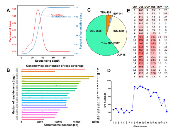 ONT測序用于對NAFLD小鼠基因組變異進行測序。經過質量控制,從對照和模型樣本(每組n z3個)中獲得643.97 Gb清潔數據,平均清潔數據量為107.33 Gb。N50值為9.89 kb,讀取的平均長度大于6.95 kb(支撐信息表S14)。根據參考基因組,每個樣本的映射率均在99.04%以上。測序深度和讀取覆蓋率的分布顯示了可接受的測序隨機性(圖6A和B,支持信息圖。S7B和S8)。實驗組中,有381個deg與差異sv重疊,其中與DEL重疊201個deg,與INS重疊99個deg,與INV重疊188個deg(輔助信息表S17)。基于基因功能,作者發現14個svv影響的DEGs參與脂質運輸和代謝(Acaca、Acsl5、Cbr3、Ces1f、Ces1g、Cryl1、Dgka、Dgkb、Dgkk、Idi1、Nlgn1、Nlgn3、Sugct和Hao2), 8個svv影響的DEGs與能量產生和轉換相關(Bckdhb、Me1、Hao2、Mt-co3、Mt-nd4、Nnt、Slc1a1和Slc1a2)。一些sv影響的DEGs與NAFLD相關,這些結果暗示SVs通過影響基因調控和染色質組織參與NAFLD的發展。