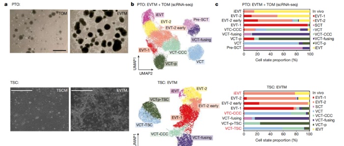 接下來,作者探討了在VCT到EVT分化過程中觸發的細胞內在調控程序是否存在于源自兩種自我更新的初級滋養層類器官(PTO)和滋養層干細胞(TSC)產生的EVTs中。通過對以下樣本進行了scRNA-seq:(1)實驗組:在EVTM培養基中分化的PTO(PTO-EVTM), 對照組:在滋養層培養基(TOM)中生長的PTO(PTO-TOM);(2)在EVTM培養基中分化的TSC(TSC-EVTM),對照組:在滋養層干細胞培養基中生長的TSCs(TSC-TSCM)。發現: