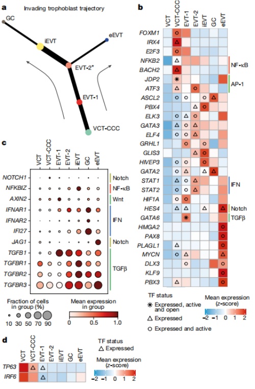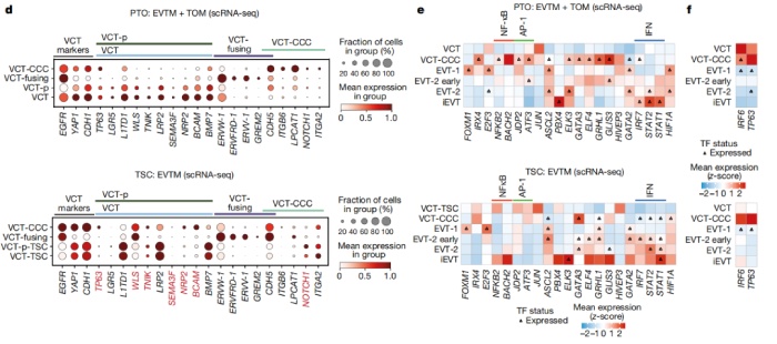 a.PTOs比TSCs更好地體現VCT的異質性。b.在PTOs中存在體內定義的四個VCT亞群,,它們表達相同的典型標志物。c.在PTO中,VCT-CCC在EVTM存在下富集,觸發 FOXM1–NOTCH1 軸 NF-κB (NFKB2和BACH2)和AP-1調制器(JDP2和ATF3),相比之下,在TSC中找不到真正的VCT。D.在TSC和PTO中,VCT-CCC(CDH5,ITGB6和LCAT1)在EVTM培養基存在下富集,從而觸發NOTCH–FOXM1軸,導致 IRF6 進一步下調和 EVT-1 中的 TP6323。