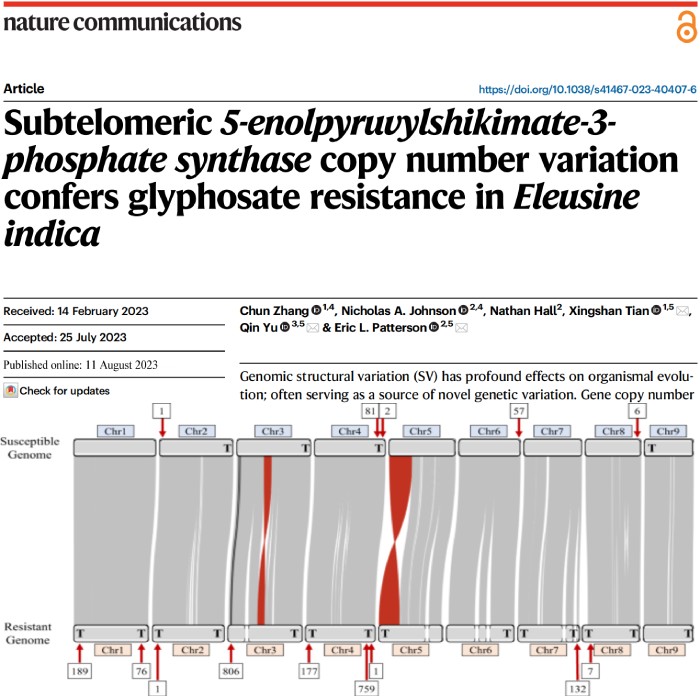 該研究首先構建了草甘膦敏感和草甘膦抗性牛筋草高質量基因組,并基于該基因組和重測序數據將草甘膦靶基因EPSPS定位于3號染色體上。進一步研究發現,在草甘膦抗性牛筋草中,EPSPS基因與其它幾個基因融合后形成復增片段插入到基因組的一個或多個亞端粒區域,而非單基因復增。此外,由于牛筋草染色體亞端粒區序列高度重復,功能基因較少,從而使牛筋草以較小的代價獲得新抗性,促進抗性種群快速進化。