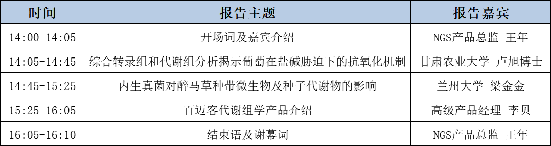 2023年9月8日,百邁客生物誠邀質譜技術研究領域的優秀博士舉辦“質譜技術引領多組學新時代”博士沙龍研討會。本次研討會由百邁客農學NGS市場部副總監王年主持,邀請了甘肅農業大學園藝學院盧旭博士和蘭州大學草地農業科技學院梁金金,分別以《綜合轉錄組和代謝組分析揭示葡萄在鹽堿脅迫下的抗氧化機制》和《內生真菌對醉馬草種帶微生物及種子代謝物的影響》為主題,共同探討質譜多組學技術在農學研究中的應用。