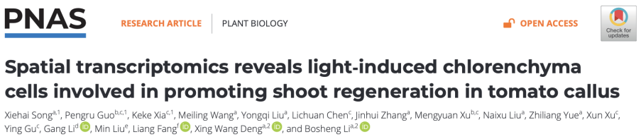 近日,北京大學現代農業研究院的李博生研究員團隊與鄧興旺院士團隊在國際學術期刊PNAS上發表了題為“Spatial transcriptomics reveals light-induced chlorenchyma cells involved in promoting shoot regeneration in tomato callus”的研究論文,建立了植物愈傷組織芽再生的空間轉錄組圖譜。