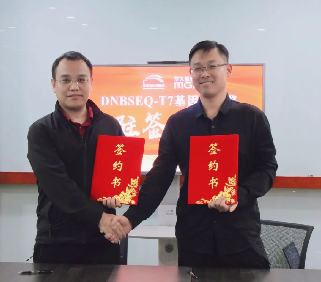 華大智造中國(guó)營(yíng)銷(xiāo)中心全國(guó)大客戶總監(jiān)趙明(左)與百邁客生產(chǎn)研發(fā)副總裁張雪川(右)