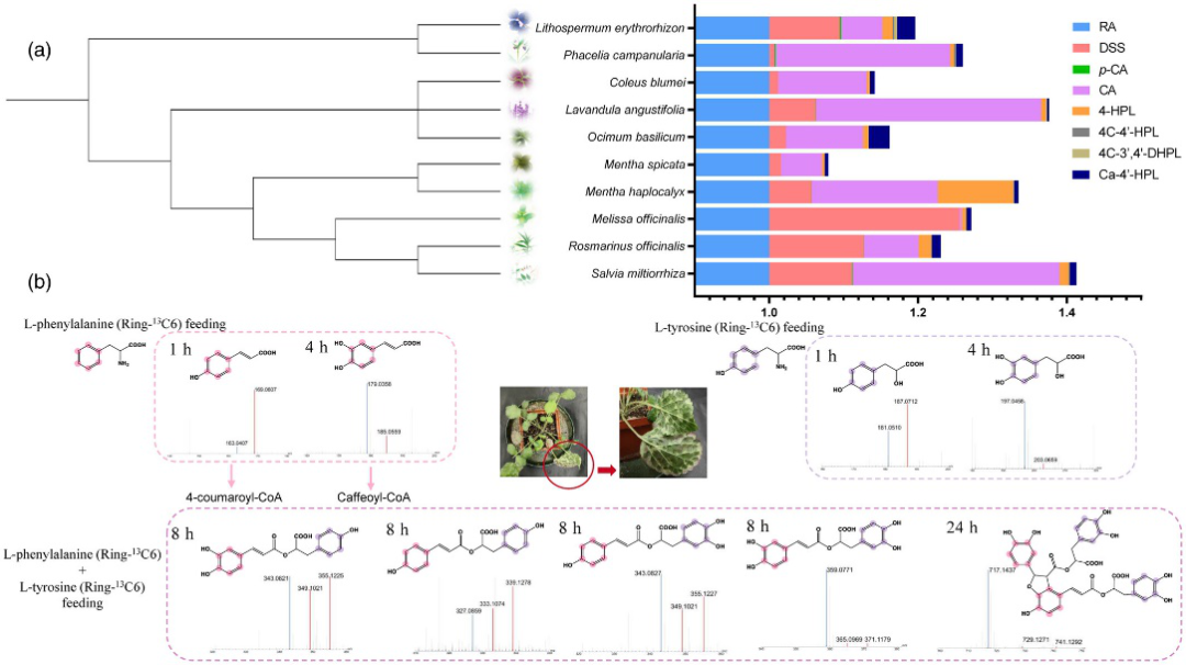 丹參中酪氨酸衍生的途徑從未被報道過,丹參素(DSS)是否參與SA生物合成仍然未知。SA的生物合成可能是多樣化的,作者在同位素標記的喂養實驗去驗證這一結論。含有同位素標記的 L-苯丙氨酸和 L-酪氨酸浸潤3個月大的丹參葉子中。從不同時間點收集的葉片中提取SA,并使用UPLC-Q-TOF/MS進行分析。結果顯示,在p-CA、CA、4-HPL、DSS、SAB和RA及其前體(包括4C-4′-HPL、4C-3′、4′-DHPL和Ca-4′-HPL)均被檢測出標記(圖1b)。這些結果驗證了作者的推測,即不同的酰基供體,包括4C-CoA和CA-CoA以及含有4-HPL和DSS的酰基受體參與SA的形成。SA的生物合成途徑是多種多樣的。