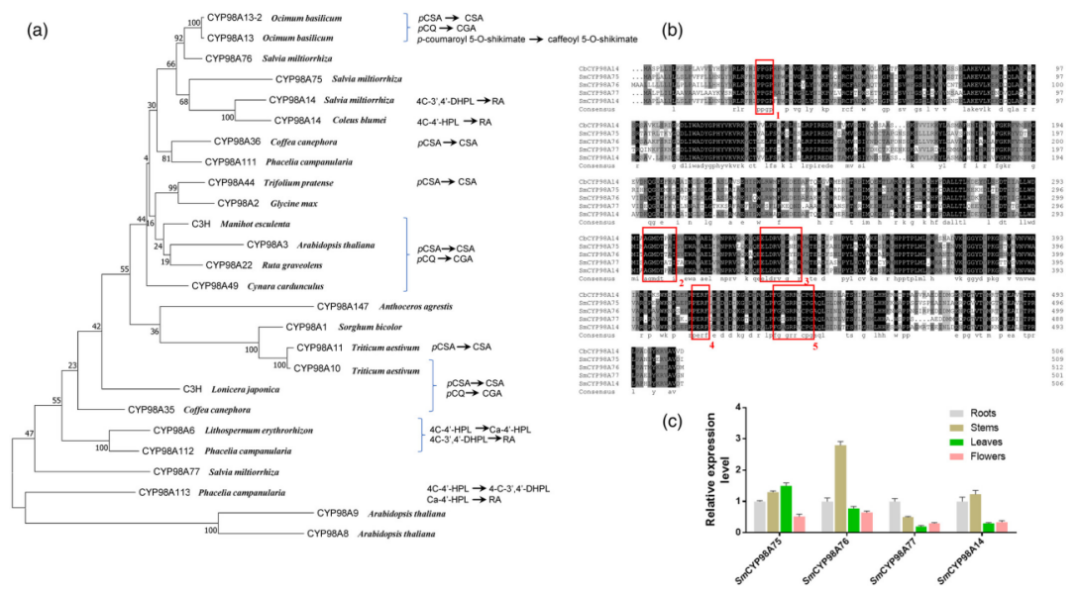 從SmCYP98A亞家族中鑒定出4種酶,分別是SmCYP98A75、SmCYP98A76、SmCYP98A77和SmCYP98A14。SmCYP98A家族酶能催化羥基肉桂酸酯的間羥基化形成RA,說明它們屬于4-香豆酰酯3-羥化酶(C3H)家族。通過鄰連接樹(NJ樹)分析,SmCYP98A酶與C3H之間的系統發育關系(圖2a)。結果表明,SmCYP98A75與SmCYP98A14和CbCYP98A14具有更顯著的序列同源性。而SmCYP98A77與其他CYP98A成員同源性較低。四種SmCYP98A 酶的氨基酸序列包含 P450 單加氧酶的幾個特征基序,例如 PERF 基序、血紅素結合半胱氨酸基序和含蘇氨酸的結合口袋(圖2b)。