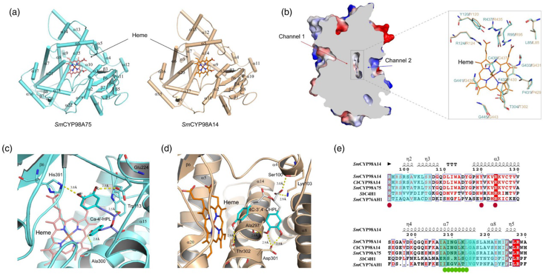 SmCYP98A75和SmCYP9814底物特異性的差異為研究底物識別和代謝的結構特征提供了機會。使用在線SWISS-MODEL進行同源建模。SmCYP98A75和SmCYP98A14的整體結構模型高度相似,表明兩種SmCYP98A的底物識別和代謝是保守的。SmCYP98A75的整體結構模型包含22個α螺旋和8個β鏈,SmCYP98A14的整體結構模型包含20個α螺旋和6個β鏈,與 SmCYP98A14 高度相似(圖5a)。在結構模型中觀察到血紅素分子與兩個 SmCYP98A 的活性結合口袋。通過與口袋內殘基的多次相互作用,它被穩定在正確的位置。兩種SmCYP98A和CbCYP98A14的血紅素包圍基序和關鍵催化氨基酸是高度保守的(圖5b)。基于與已知 P450 的疊加,通道 1 可能容納底物進入和產物,而通道 2 可能使血紅素能夠進入水和質子。