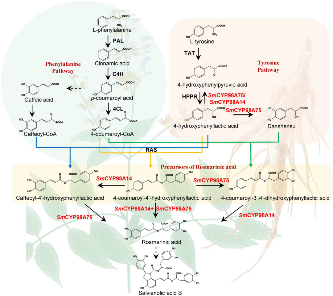丹參酸(SA)、迷迭香酸(RA)、丹參素(DSS)和丹酚酸B(SAB);迷迭香酸合酶(RAS)