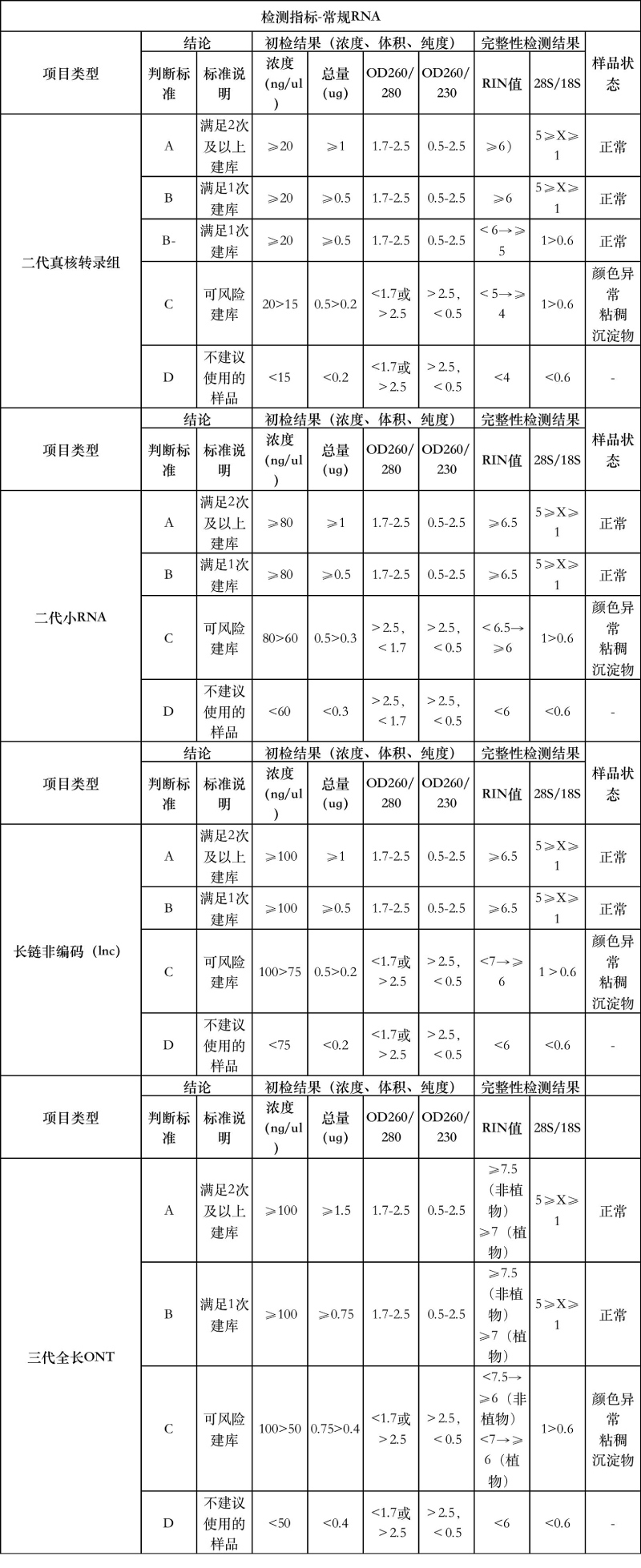 2、以上均是單個文庫的總量要求,如果樣品做多個文庫按(小 RNA>LNCRNA>轉錄組 RNA)判。總量不足的文庫有樣品判 C 不通過,無不合格原因,根據二次提取的總量判定。無樣品根據剩余總量判判定下一文庫。
