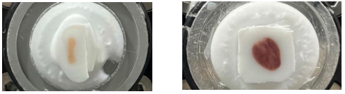 5. 將包含組織和OCT的包埋盒放在干冰粒上輕輕按壓(如下圖,左),確保水平(否則會(huì)影響組織的方向,同時(shí)能保證干冰粒與包埋塊的接觸面積最大以達(dá)到快速降溫的效果),直到包埋塊完全凍結(jié)變白(如下圖,右)。