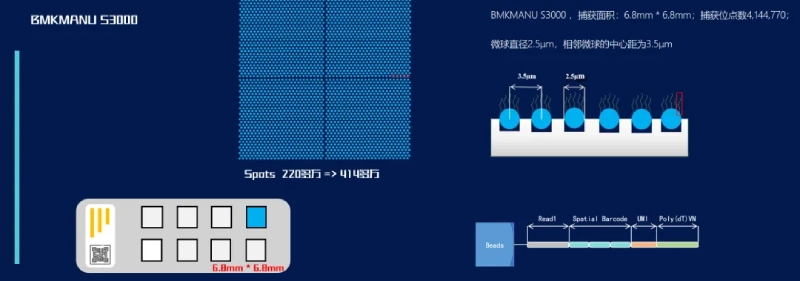 發布會中,百邁客生物智能制造副總裁劉敏對百創S3000空間轉錄芯片的性能進行了詳細介紹。百創S3000在6.8mm*6.8mm的捕獲區域內鋪設了4,144,770個捕獲位點,相鄰兩個捕獲位點的中心距為3.5μm。相較于現在廣受市場認可與好評的百創S1000轉錄組芯片,捕獲位點數提升近2倍,分辨率同樣提升近2倍。
