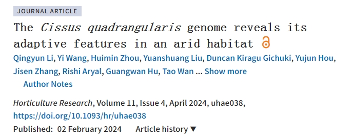 2024年4月,Horticulture Research?在線發表了中國科學院武漢植物園等單位合作完成的題為《The?Cissus quadrangularis?genome reveals its adaptive features in an arid habitat》?的研究論文,主要報道了方莖白粉藤染色體級別的基因組組裝結果,并初步解析了其干旱適應性機制。