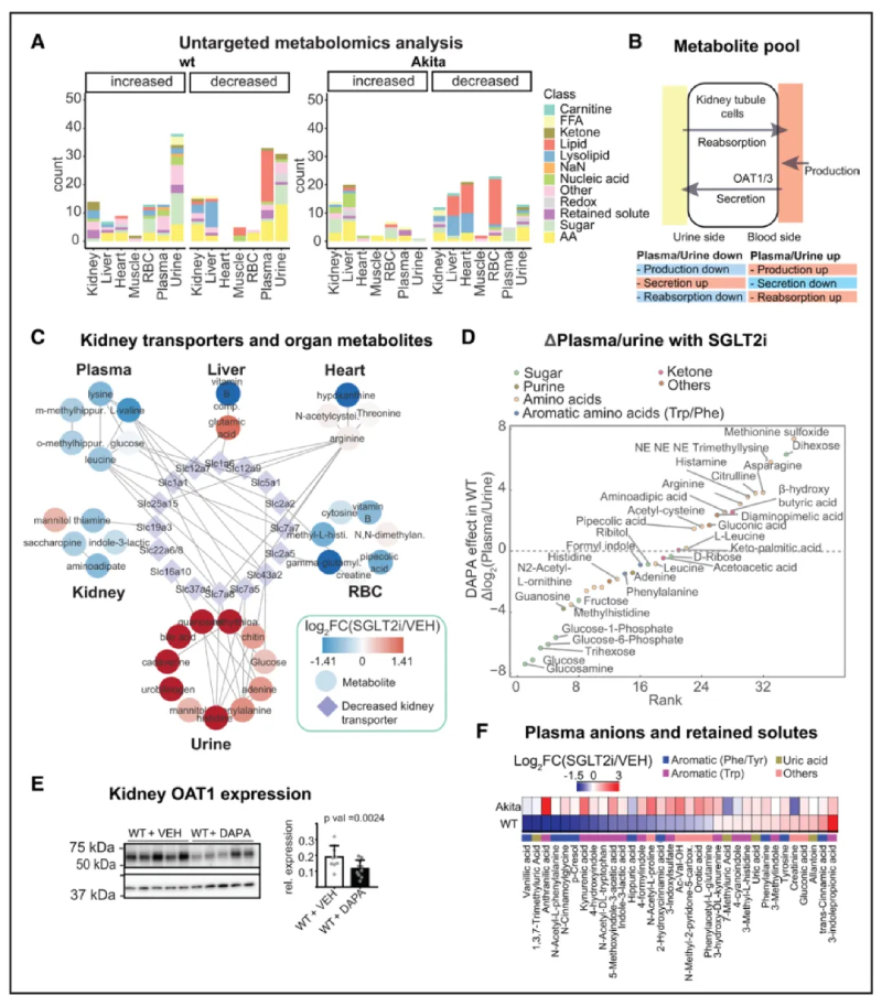 丹麥奧胡斯大學學者在Circulation雜志上發表題為“Metabolic Communication by SGLT2 Inhibition“研究論文,研究團隊使用Akita小鼠模型和臨床隊列樣品,通過整合宏基因組、代謝組、蛋白組等多組學數據,確定了SGLT2i對腎臟、心臟、血管和其他器官的幾種SGLT2依賴性效應和脫靶效應,通過重構腎臟代謝物轉運和全身代謝通訊,發揮心腎保護作用。提供了關于SGLT2相互作用因子和SGLT2i依賴性蛋白質組、代謝組、磷酸化蛋白質組和宏蛋白質組的新見解,從而為SGLT2i新型和早期機制靶標提供了潛在的路線,促進代謝藥物的開發。