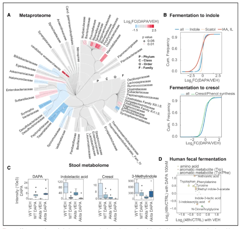 使用苯丙氨酸等芳香族氨基酸作為底物可以減少甲酚和苯酚的生成劑(圖4B)。糞便代謝組檢測表明顯示糞便中存在達格列凈(圖4C)。在達格列凈治療小鼠的這些糞便樣本中,色氨酸和苯丙氨酸發酵的代謝物有所減少(圖4C)。為了探究達格列凈在糞便中的直接作用,將SGLT2i添加到人糞便中。厭氧發酵后,發現吲哚乳酸、色氨酸代謝物和肉桂酰甘氨酸減少(圖4D);也就是說,與WT小鼠血漿中SGLT2i 減少的化合物相關的化合物(圖3F)。在人體糞便發酵中添加SGLT2i也逆轉了這些毒素母體分子的消失,特別是芳香族氨基酸色氨酸、酪氨酸和苯丙氨酸(圖4D)。