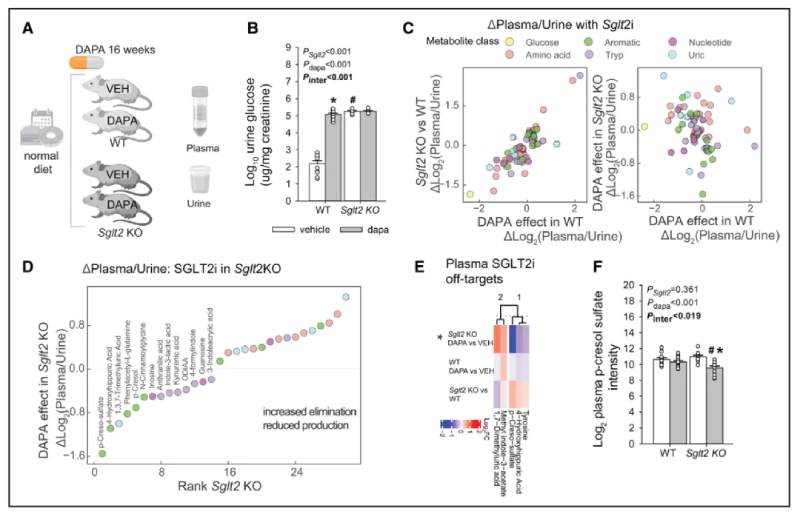 在SGLT2 KO和WT小鼠中,許多代謝物的比率發生了類似的變化,就像在WT小鼠中使用達格列凈和溶劑處理一樣(圖5C左圖),這表明SGLT2抑制的后果。在其他方面,葡萄糖比率的下降,反映了尿糖排泄的增加。正如預期的那樣,SGLT2的缺失阻斷了達格列凈對葡萄糖排泄的影響(圖5C右圖)。另一方面,達格列凈顯著改變了SGLT2 KO小鼠體內許多代謝物的比例,表明了一種偏離靶點的效應(圖5D)。血漿:尿液比例的排名變化顯示,達格列凈降低了SGLT2 KO小鼠中多種芳香酸代謝物的比例,包括甲酚和馬尿酸鹽,其次是色氨酸代謝物。血漿水平分析確定了SGLT2i在SGLT2 KO環境中顯著改變的5種代謝物,包括PCL硫酸鹽和一種修飾的馬尿酸(圖5E和5F)。該實驗表明SGLT2i治療具有非靶點效應,包括對甲酚、馬尿酸鹽和色氨酸代謝物。