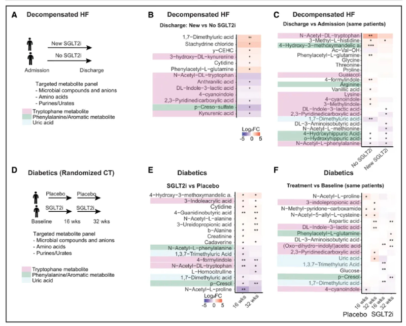 鑒于腎臟SGLT2相互作用組以及微生物對SGLT2i的反應在小鼠和人類中相似,我們想知道SGLT2i是否會影響循環中的溶質,在縱向數據中與心血管相關。對來自2個獨立研究的患者的血漿樣本進行了靶向代謝組分析,目標是80個有機陰離子和尿毒癥毒素。在第一組>40名患者中,在失代償性心衰的真實環境中分析了這種影響(圖6A)。結果表明,SGLT2i顯著降低或鈍化了心力衰竭患者血漿中幾種有機陰離子的增加,但僅當住院期間添加SGLT2i時(圖6B和6C)。包括幾種色氨酸代謝物,如ILA、犬尿酸和乙酰色氨酸,以及苯丙氨酸代謝物苯乙酰谷氨酰胺和PCL硫酸鹽。分析了在糖尿病患者中使用SGLT2I(依帕列凈)的隨機對照試驗的縱向數據(圖6D)。與基線和安慰劑相比,二甲基尿酸和三甲基尿酸的血漿濃度降低,PCL降低,吲哚代謝物增加緩慢(圖6E和6F)。在兩項臨床研究中,降低的溶質大部分來自嘌呤代謝和腸道芳香氨基酸代謝,這與在小鼠身上觀察到的代謝器官一致。