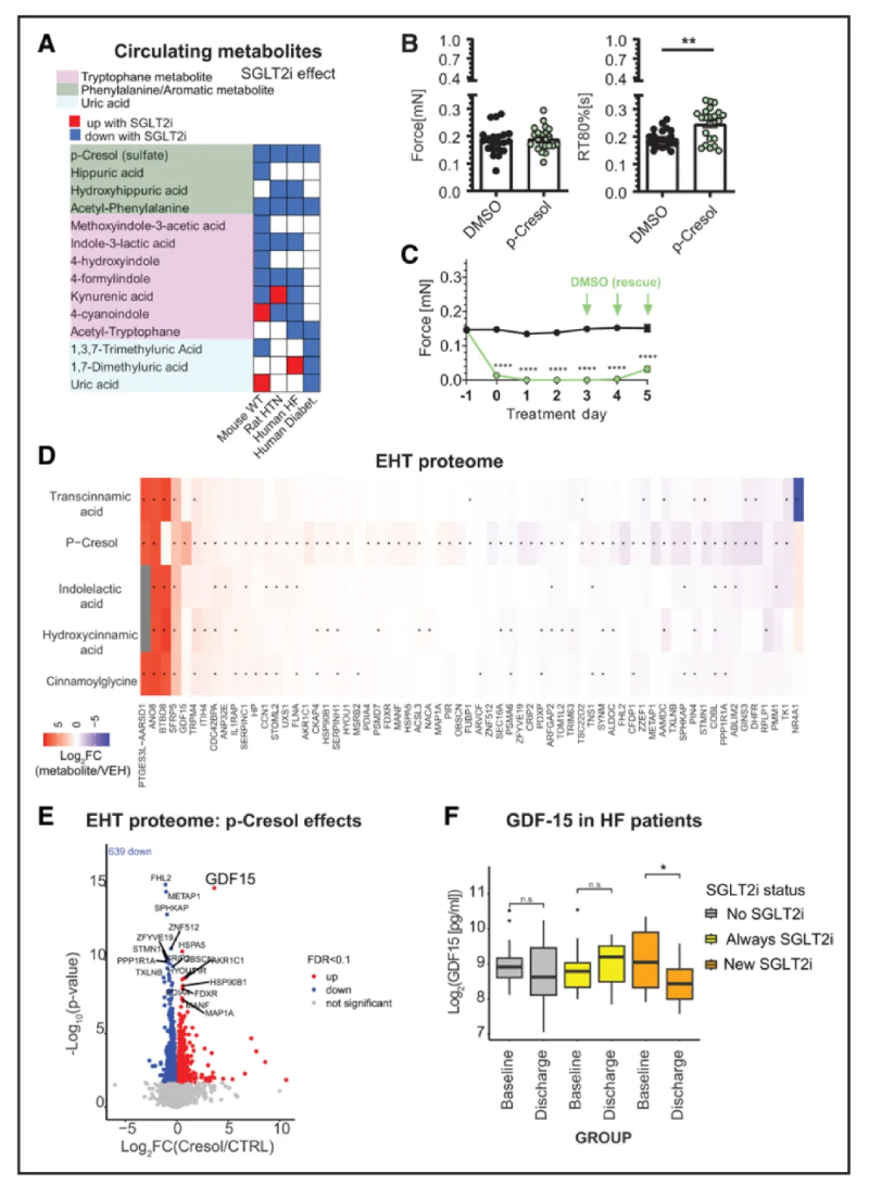 為了進一步闡明該機制,對用300μM PCL、吲哚乳酸和3種其他芳香族代謝物處理的 EHT 組織進行了蛋白質組學分析(圖7D)。觀察到最強烈的變化是 PCL 的反應(圖7D)。多種蛋白質的增加包括心臟病相關通道TRPM4、 FLNA和生長因子CCN1;減少的蛋白質包括 PPP1R1A,其下調已被報道為人類HF的標志。PCL改變的蛋白質組的一個獨特特征是心臟肌節相關蛋白的減少(圖S7D),以及應激信號 GDF15的強烈感應(圖7E)。考慮到HF患者中該通路的調節,檢測了GDF15 水平,發現接受SGLT2i治療心力衰竭的患者循環 GDF15 減少(圖7F)。