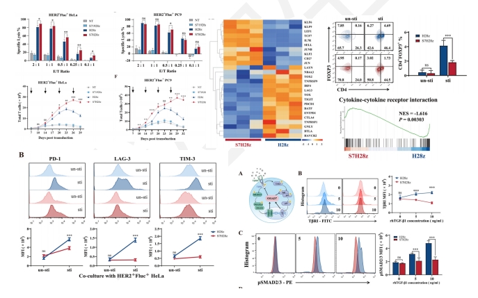 利用T2A元件,作者設(shè)計(jì)了針對(duì)CD8α柄、共刺激結(jié)構(gòu)域(CD28)和CD3ζ細(xì)胞內(nèi)結(jié)構(gòu)域,共翻譯表達(dá)SMAD7片段的CAR-T細(xì)胞(S7H28z,S71928z,S7M28z),長(zhǎng)期培養(yǎng)后發(fā)現(xiàn),SMAD7顯著改善了CAR-T細(xì)胞與表達(dá)HER2的HeLa細(xì)胞共培養(yǎng)時(shí)的細(xì)胞毒性,同時(shí)當(dāng)與HER2+HeLa細(xì)胞共培養(yǎng)時(shí),表達(dá)SMAD7的CAR-T細(xì)胞與不含SMAD7?CAR-T細(xì)胞相比增殖更快。為了更好地理解SMAD7如何影響CAR-T細(xì)胞的基因表達(dá)譜,我們將其與HER2+Fluc+ HeLa細(xì)胞共培養(yǎng)后進(jìn)行了轉(zhuǎn)錄組測(cè)序,與傳統(tǒng)的CAR-T細(xì)胞相比,共表達(dá)SMAD7的細(xì)胞系中標(biāo)志T細(xì)胞衰竭的PDCD1、LAG3和TIGIT顯著下調(diào),同時(shí)標(biāo)志T細(xì)胞持續(xù)激活并分化為記憶表型的CD27、Jun和KLF9上調(diào),富集分析結(jié)果表明傳統(tǒng)CAR-T細(xì)胞與共表達(dá)SMAD7的細(xì)胞之間的差異基因主要富集在T細(xì)胞分化、近端T細(xì)胞受體信號(hào)通路和細(xì)胞因子產(chǎn)生等通路,這些結(jié)果表明,共表達(dá)SMAD7的CAR-T細(xì)胞的特點(diǎn)是在抗原暴露后可減輕衰竭和減少細(xì)胞因子的產(chǎn)生。