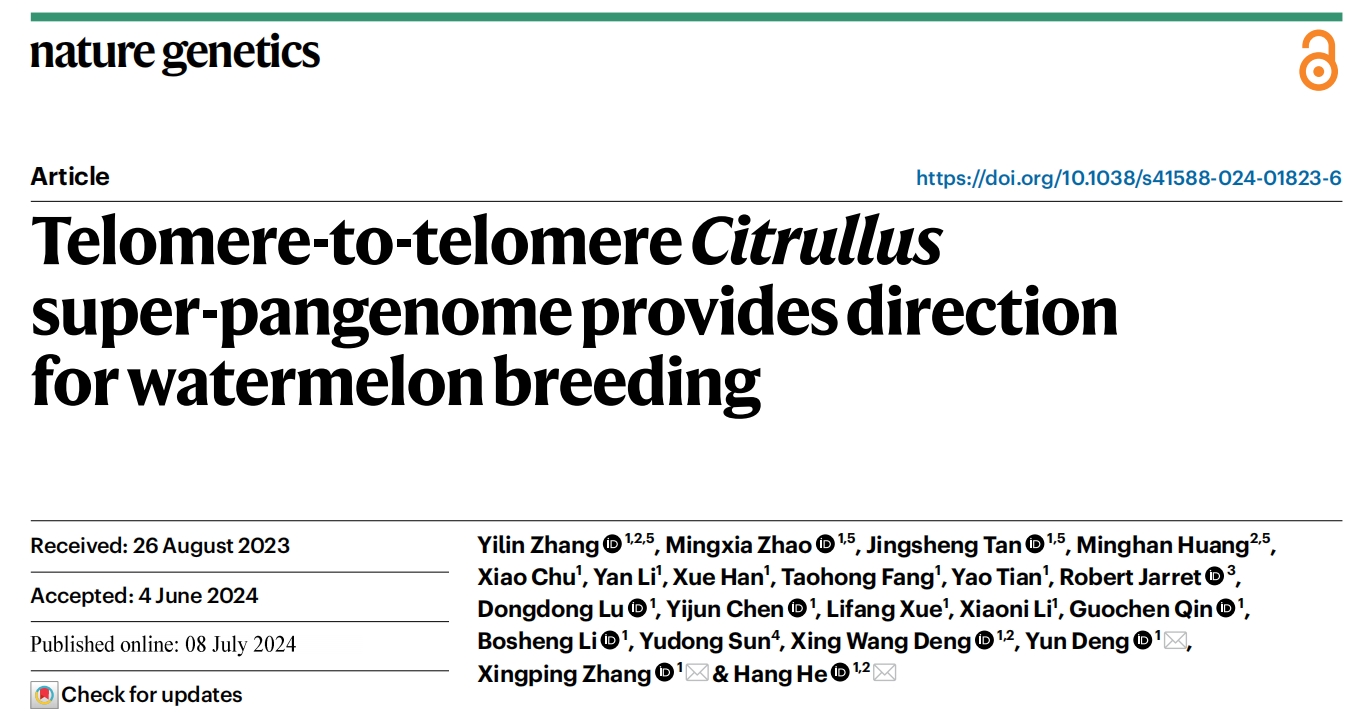 2024年7月8日,北京大學(xué)現(xiàn)代農(nóng)業(yè)研究院在國際頂尖期刊《自然-遺傳學(xué)》上在線發(fā)表了題為Telomere-to-telomere?Citrullus?Super-pangenome Provides Direction for Watermelon Breeding的研究成果,是西瓜科研領(lǐng)域的重大突破。