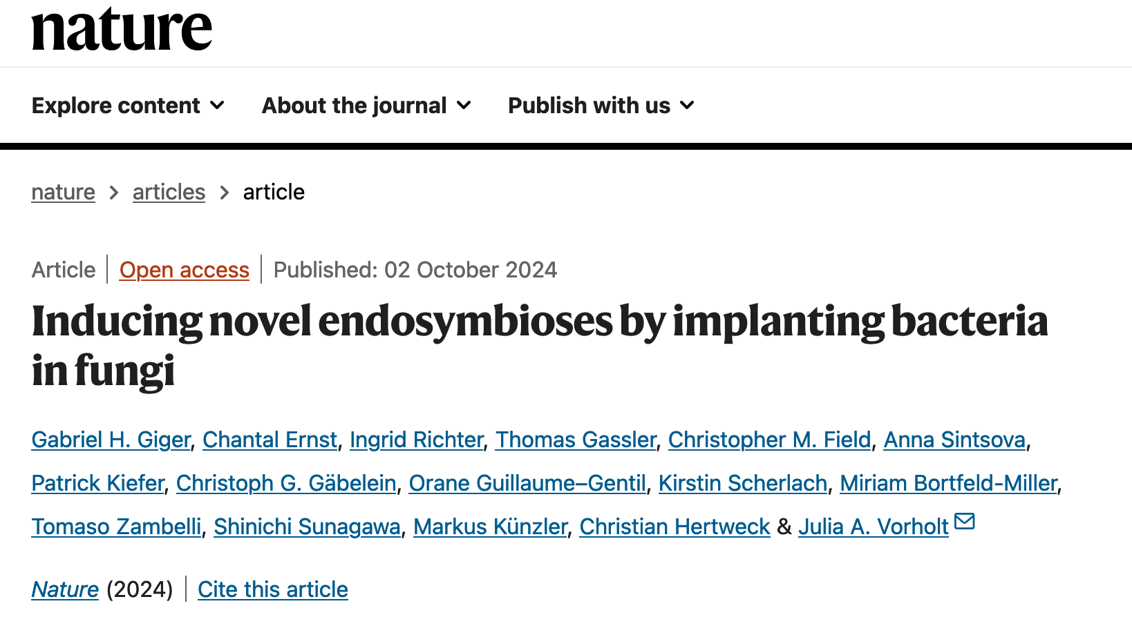 Giger, Gabriel H., Ernst, Chantal., Richter, Ingrid., Gassler, Thomas., & Field, Christopher M.. (2024). Inducing novel endosymbioses by implanting bacteria in fungi. Nature.