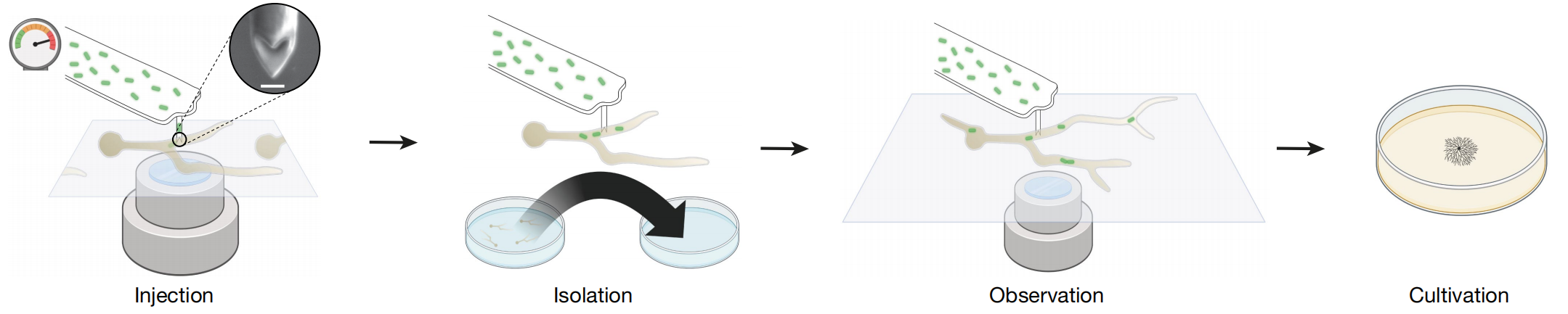使用 FluidFM 技術,在不破壞真菌小孢根霉(R. microsporus)細胞的情況下將細菌植入其中,通過該技術,單次注射可將1-30個細菌注入R. microsporus內,同時可通過實時成像觀察人工誘導的內共生現象的命運。用GFP標記的M. rhizoxinica注射入EH型絲狀真菌,細菌成功在絲狀真菌內定殖并能垂直傳遞(遺傳),表明通過注射方法可以重建自然內共生。