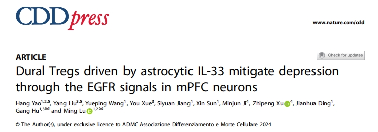 2024年11月,南京醫科大學基礎醫學院藥理學系魯明教授、胡剛教授團隊在Cell Death & Differentiation發表題為”Dural Tregs Driven by Astrocytic IL-33 Mitigate Depression Through the EGFR Signals in mPFC Neurons”的研究論文,使用單細胞轉錄組測序技術等多種技術,深入闡述小鼠硬腦膜免疫細胞的抗抑郁機制,為抑郁癥治療提供了新的潛在治療靶點。接下來是本文的詳細解讀。